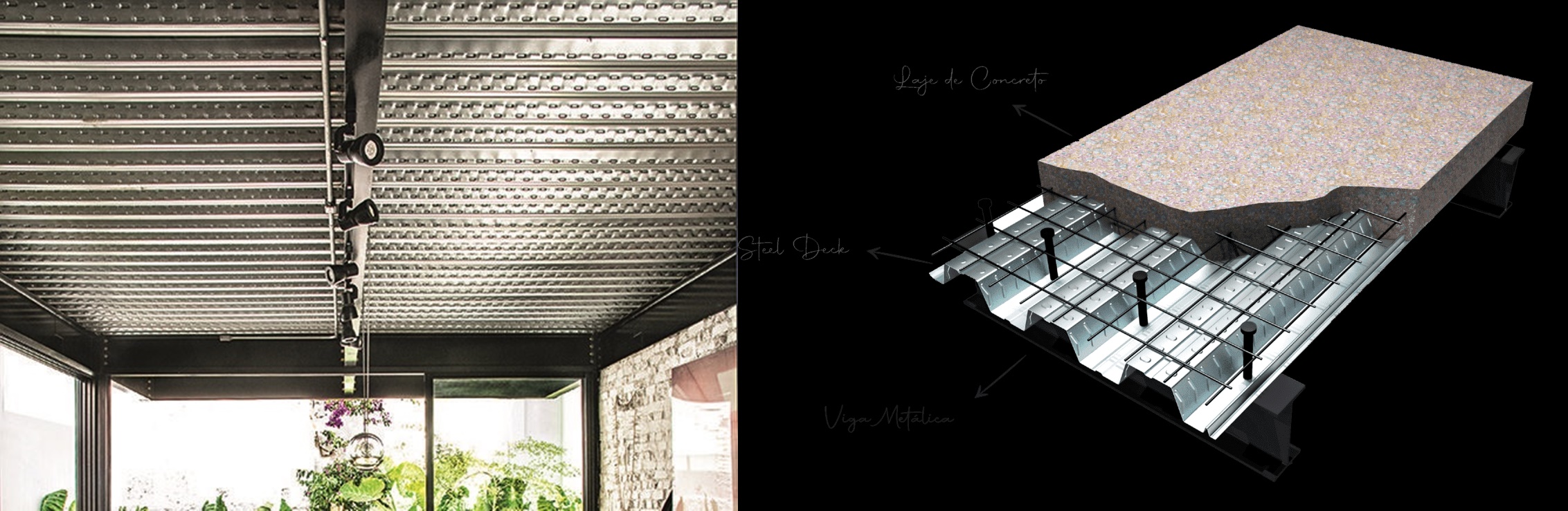 Geralmente para construções em estrutura metálica utilizamos a laje tipo steel deck. Este sistema consiste basicamente de uma chapa corrugada galvanizada apoiada sobre o sistema de vigamento na qual será executada uma capa de concreto e posteriores acabamentos.